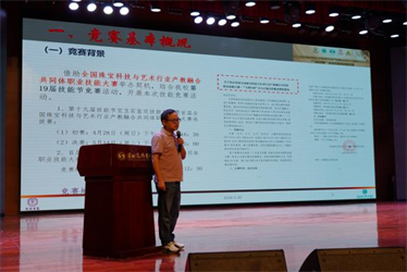 珠宝学院第十九届技能节总结暨表彰大会于2024年5月30日下午会议中心举行。深圳技师学院校党委委员、副校长冉建中、校党委办公室主任申祖霞、教务处处长文平、科研发展办公室主任朱爱群、招生就业处处长刘超、珠宝学院院长王惊涛、学生处副处长申海林、总务处副处长孙晓、珠宝学院副院长陈明、副院长张艳婕,深圳市百合彩宝珠宝有限公司、深圳市零犀文化创意有限公司、深圳市硅行天下科技有限公司、深圳市飞博尔珠宝科技有限公司、深圳市甘露珠宝首饰有限公司、深圳市峰汇珠宝首饰有限公司、信德缘集团有限公司代表出席了本次活动。此次技能节不仅是对珠宝学院师生技能水平的一次全面检阅,也是学院教育教学成果与企业合作成效的集中展示。