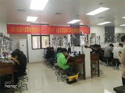 四月二十六日下午13:30,由珠宝首饰设计与制作专业主办的“广东百师园《满庭芳·国色》景泰蓝设计制作技能竞赛”在能工楼339进行。